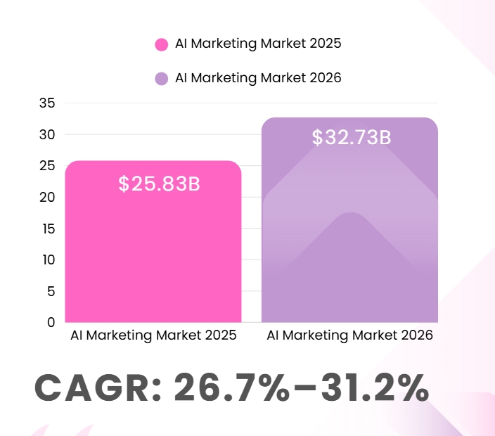 The financial trajectory of the AI in Marketing market illustrates a period of hypergrowth. The market is forecast to expand from $25.83 billion in 2025 to $32.73 billion in 2026, a significant year-over-year increase that signals strong and sustained investment.1 This growth is projected to continue at a compound annual growth rate (CAGR) ranging from 26.7% to as high as 31.2%, depending on the forecast model and timeframe.1 This rate of expansion is particularly notable when contextualized within the broader technology landscape. While overall worldwide IT spending is expected to grow by a respectable 9.8% in 2026, the AI in Marketing sector is expanding at nearly three times that pace.4 This outsized growth is a clear indicator of its strategic importance and perceived return on investment by corporate leaders.
