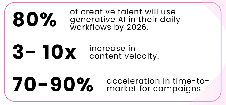 The adoption rate of generative AI among creative teams is projected to be nearly universal. A definitive forecast indicates that 80% of creative talent will use generative AI in their daily workflows by 2026.17 The efficiency gains from this integration are expected to be massive, with organizations realizing a 3- to 10-fold increase in content velocity and a 70% to 90% acceleration in time-to-market for campaigns and assets.30 While this scale is a significant advantage, it is also the source of the “homogenization crisis,” where the reliance on AI can lead to the production of “bland, emotionless messages” that lack the distinctiveness required to capture consumer attention.24